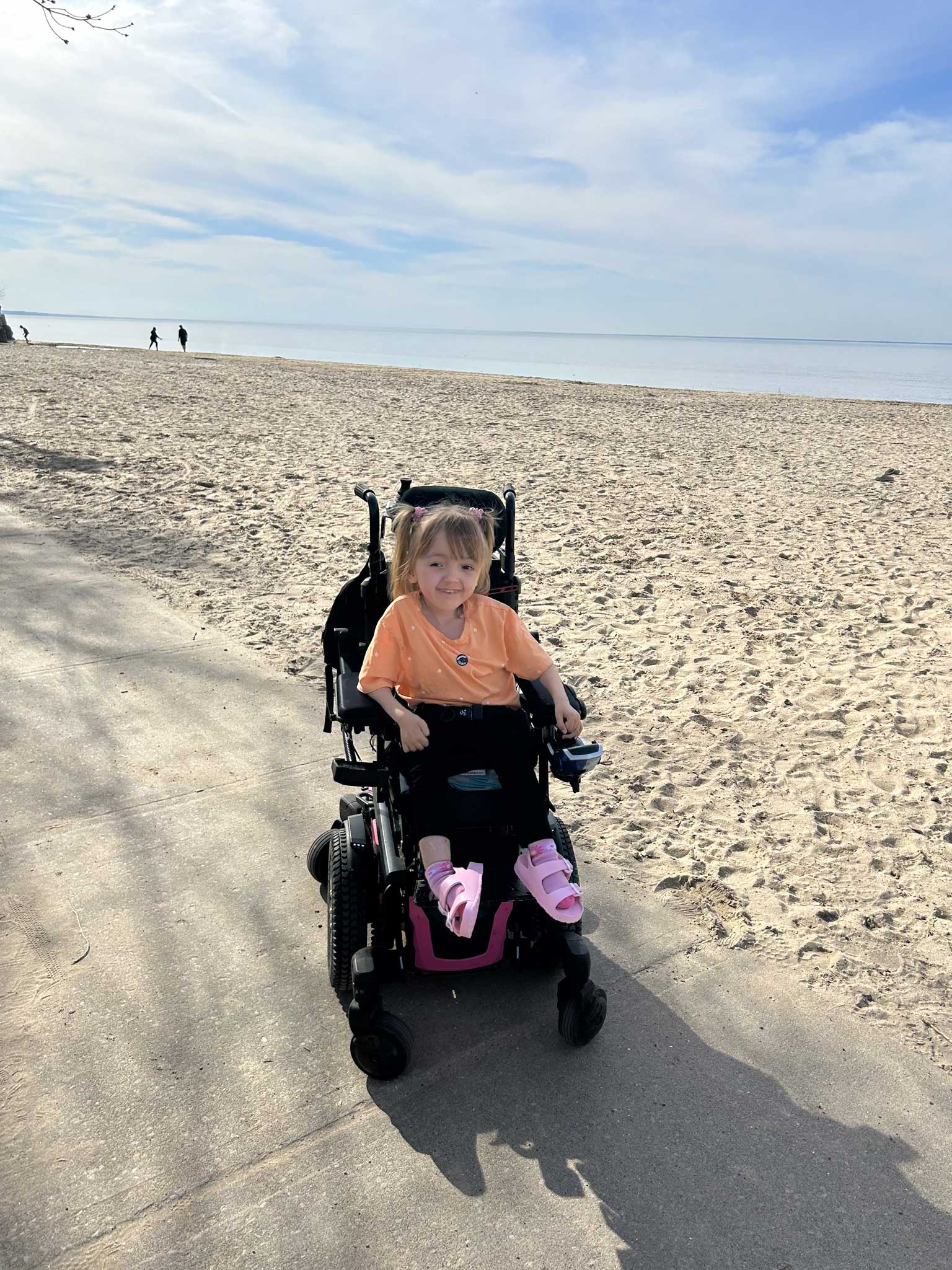 Stretto allowing her to cross all the different terrains, sand, beach mats, gravel etc. The waves lapped gently against the shore, creating a soothing rhythm that set the perfect mood for the day. Though Lennon loved the feeling of sand between her toes, what she enjoyed most was the fresh, open air and the view of the vast lake stretching endlessly in front of her, as her toes touched the water. We made sure she had a great spot in the shade, where she could relax and enjoy the breeze while she and Leighton, her younger sister, busied themselves making sandcastles along the edge of the water.